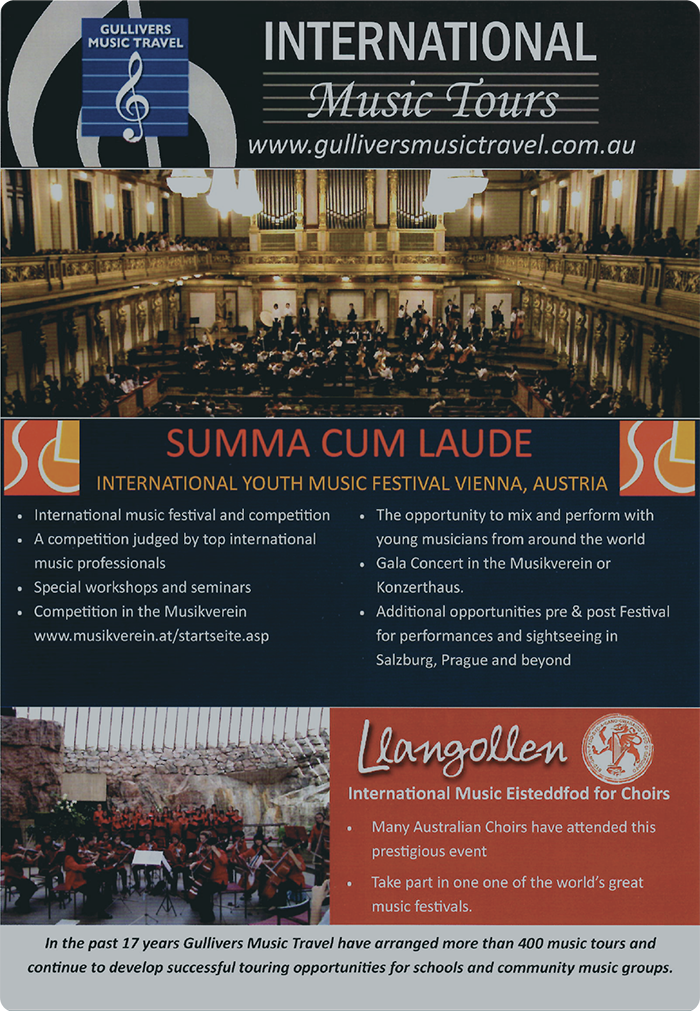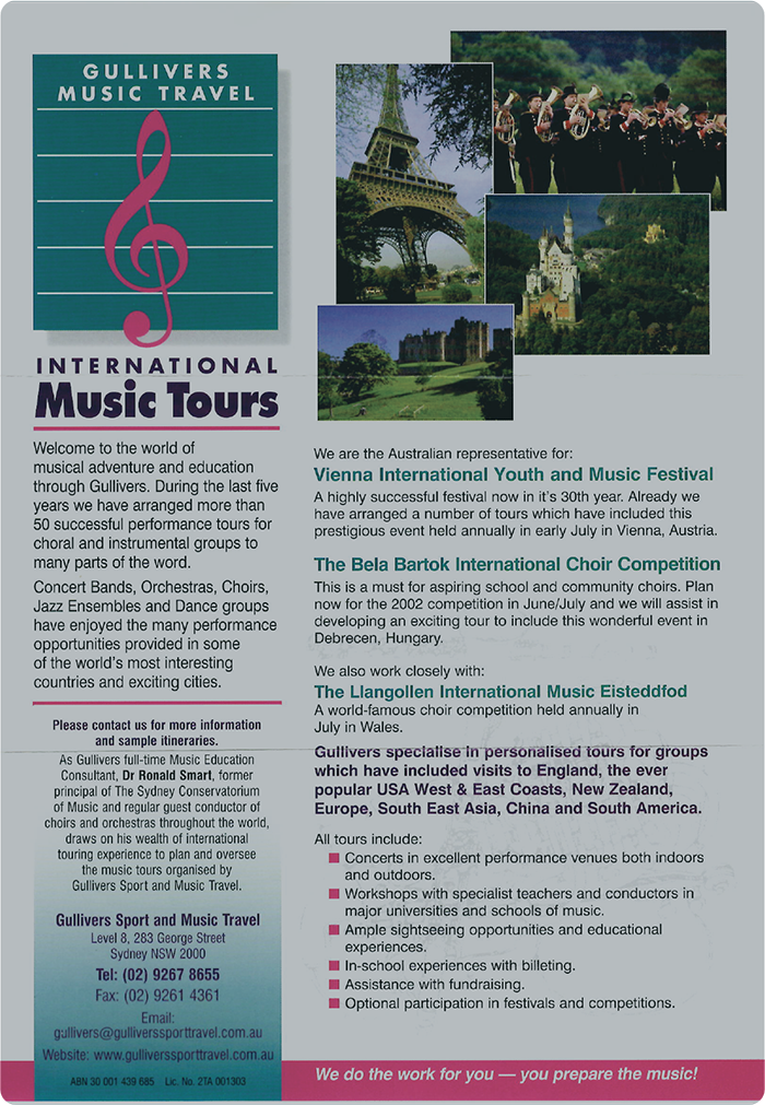 Our tour planning was in excess of 12 months in the making, and, throughout that period of time, I appreciated the many hours the Gullivers team devoted to our planning. They were only ever a phone call away and always willing to listen and understand our requirements. Our tour was very complicated with the number of participants (77 students), the number of large instruments (300kg), and the shadow parent tour following us. But our tour surpassed all of my expectations. Everything was superbly organised, well planned, thoroughly thought through, and allowed us to add in the special touches and extra experiences that were important to us.